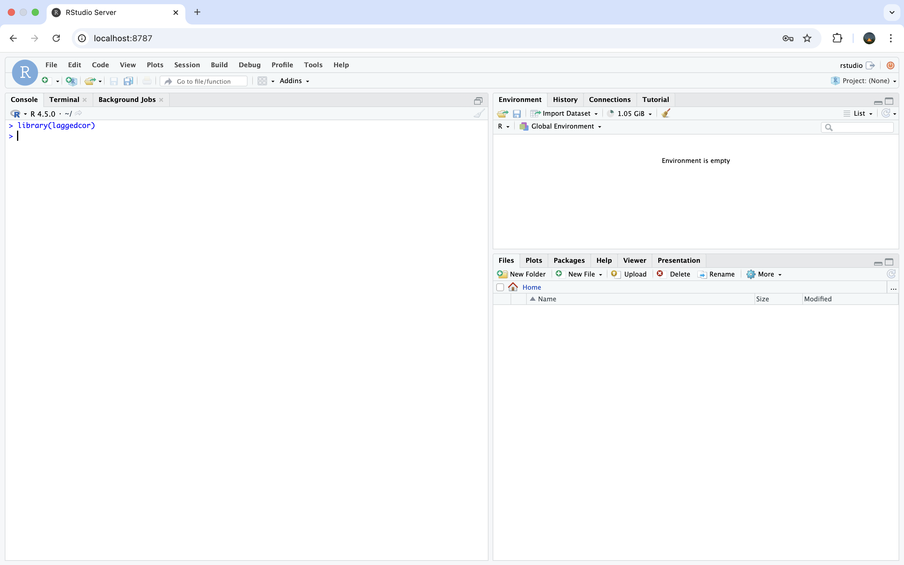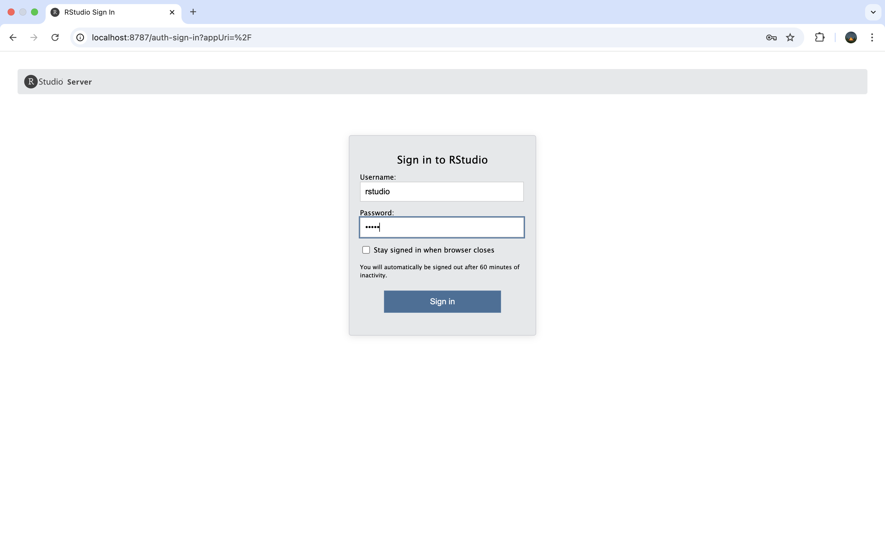 Then open the browser and visit http://localhost:8787 to power on RStudio server. The user name is rstudio