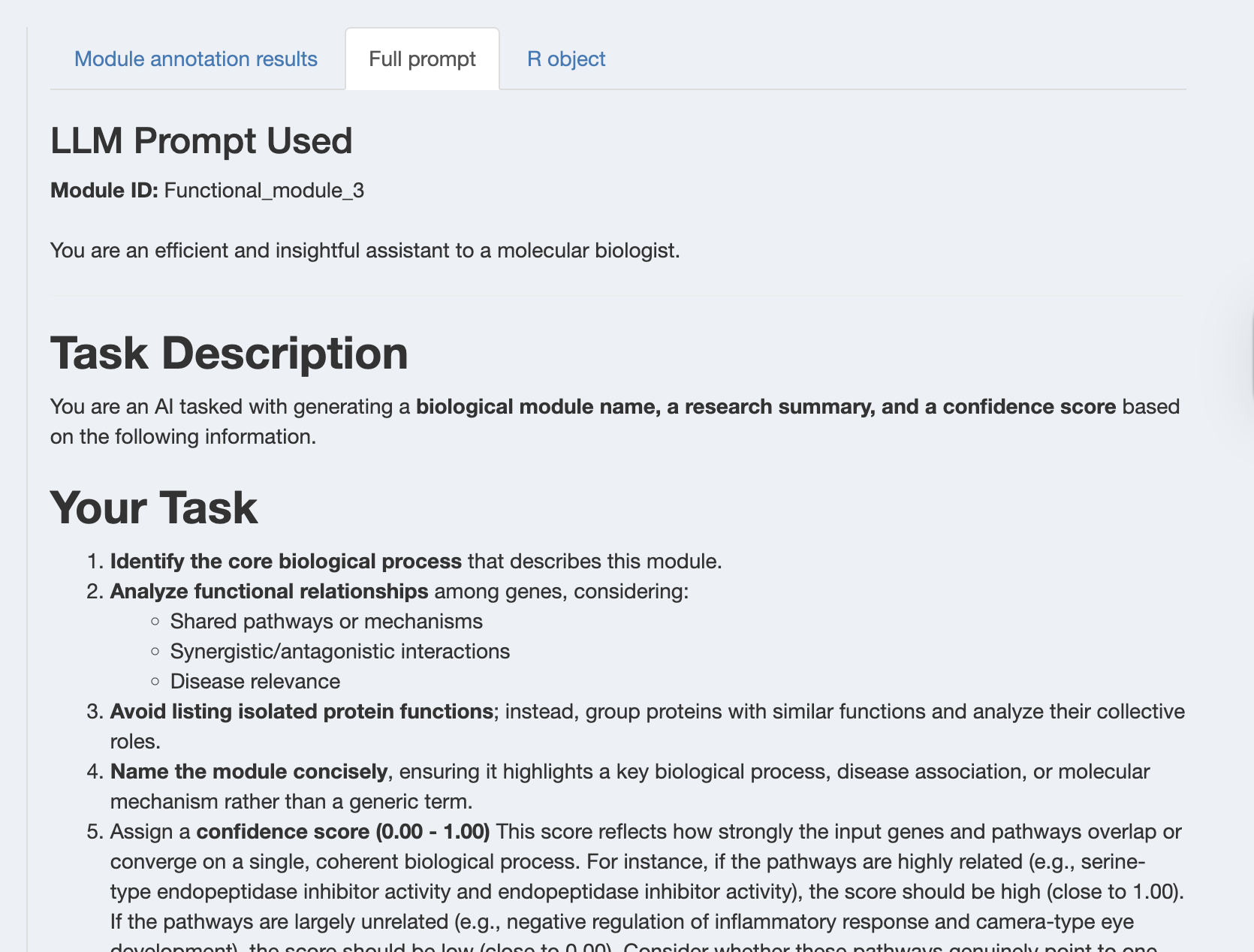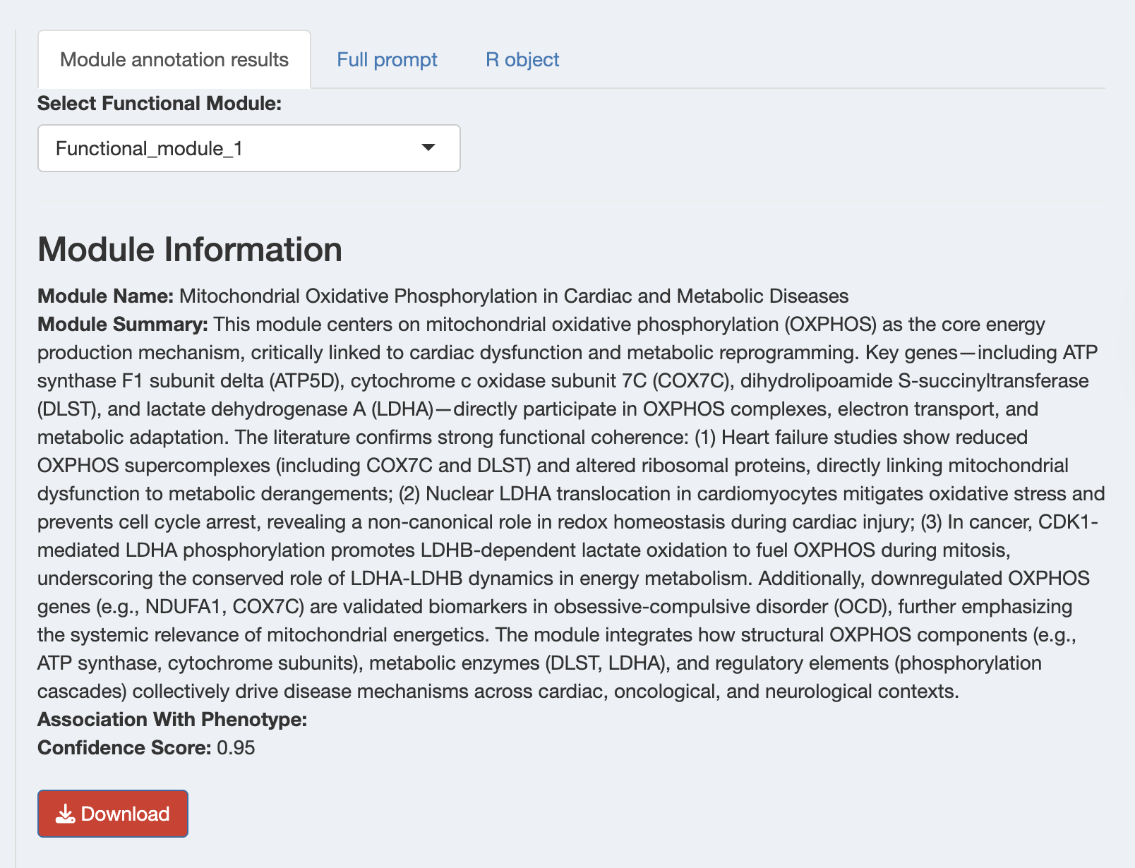 The functional module results are automatically enhanced with an additional column, llm_module_name, which contains the names generated by the LLM. You can download the complete R object for future reference in the Step 2: Check Module Annotation Result panel.